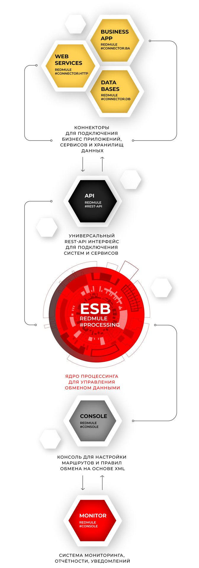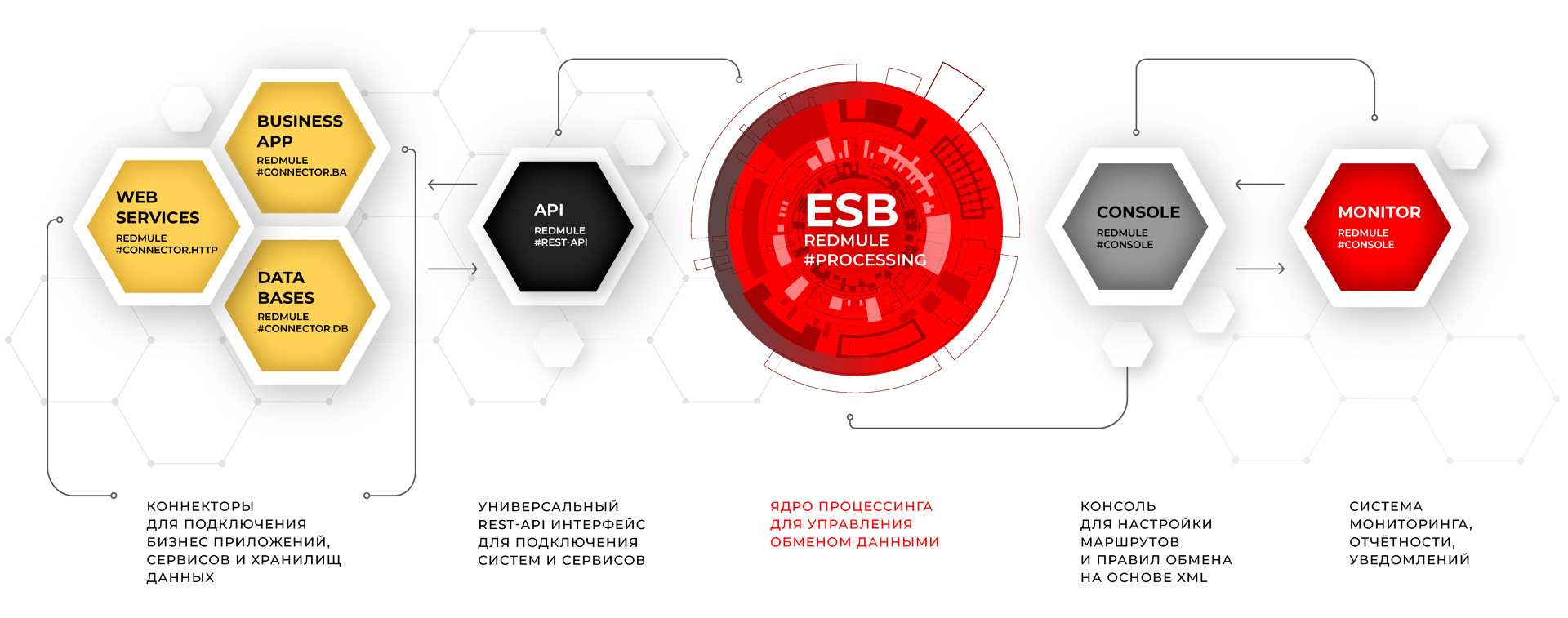 RedMule обеспечивает высокоскоростной гарантированный обмен данными распределённых информационных систем, приложений, файловых хранилищ, очередей сообщений, баз данных, IoT устройств и различных внешних сервисов